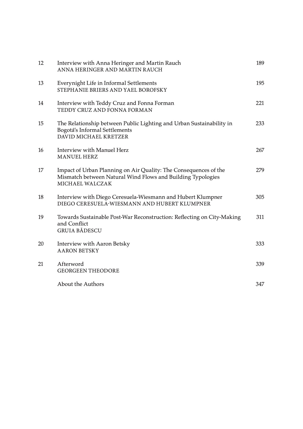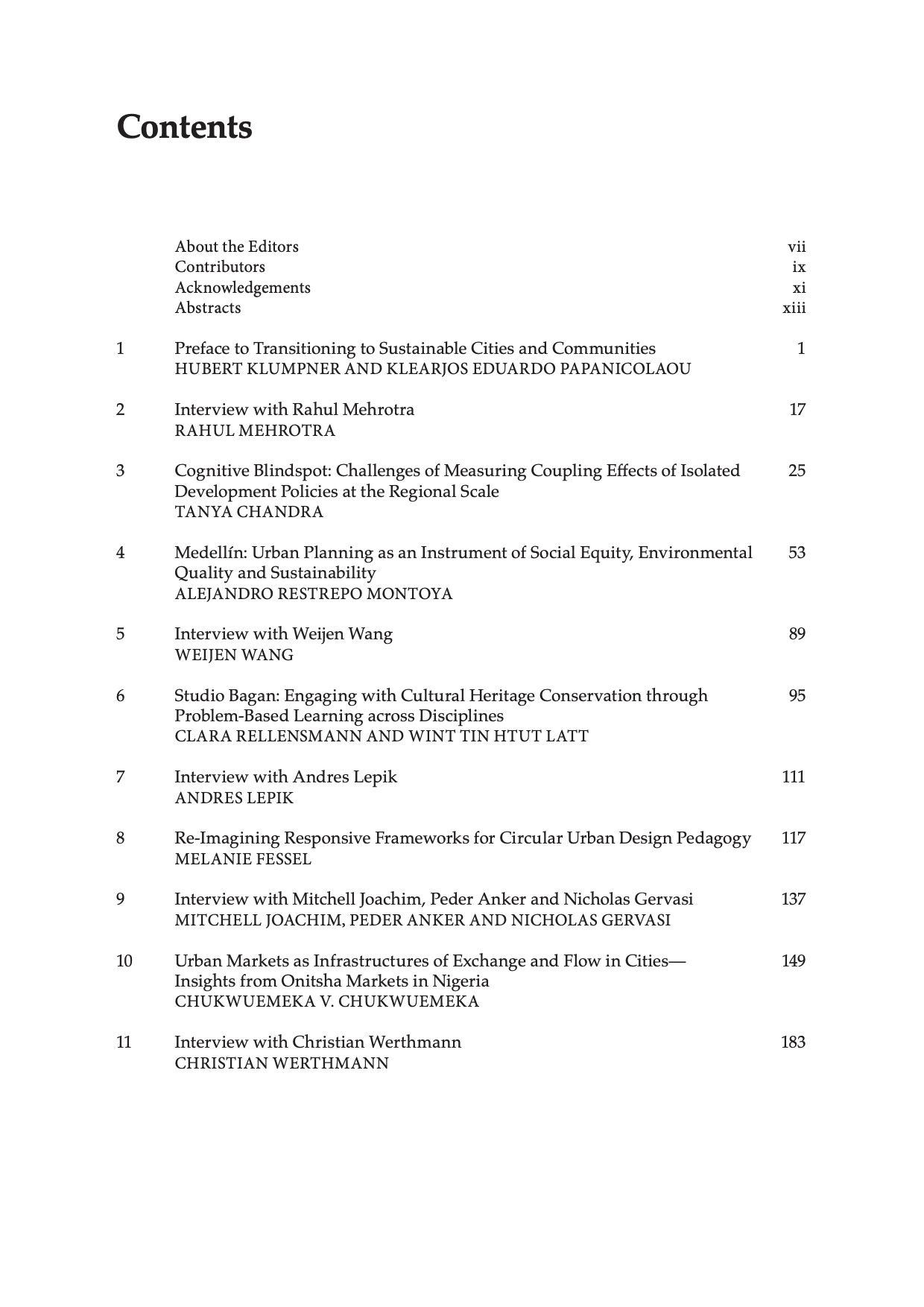 TRANSITIONING TO SUSTAINABLE CITIES AND COMMUNITIES is an edited volume of scholarly articles and interviews from leading experts working in architecture, urban design,planning, and landscape architecture. Contributions address the challenges and opportunities prompted by the United Nation’s Sustainable Development Goal 11 (SDG11), and by extension, the climate crisis. The volume showcases a range of novel research, new spatial planning perspectives, and innovative design approaches that are contributing to making cities more inclusive, safe, resilient, and sustainable today. The volume’s authors respond to key sustainability issues, such as air quality/pollution, safety and lighting in informal settlements, equity and inclusion in urban development, affordable housing production, cultural heritage conservation, and post-war planning and rebuilding. The intended readership of this volume includes academics, architects, urban designers, landscape architects, urban and regional planners, policy-makers, and public sector consultants working in cities and urbanizing areas. Drawing largely from examples in the Global South, where various forms of scarcity give rise to inclusive and sustainable solutions for the entire world, the volume contributes first-hand professional perspectives, evidence-based solutions, case studies, and projects.
